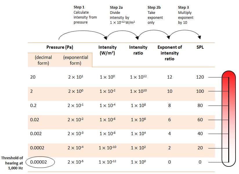 When traveling in the air, sound with the pressure of 20 Pa is equivalent to that with 1 W/m2 of sound intensity, as shown in Figure 3 above. As sound intensity is proportional to the square of its pressure, we can derive the sound intensity at the other pressure. We can see here that the exponents of sound intensity for 20 Pa and 0.00002 Pa are 0 and -12, respectively. However, they didn’t want to have a negative value. Hence, they made the intensity at the threshold of hearing as the reference value. It then brings us to the second step.